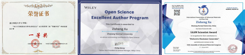 本团队研发了无源化高性能的交流型介电弹性体介电弹性体发电机,解构了介电薄膜材料在高压下的击穿行为,构建了抑制薄膜材料高压击穿行为的双模结构结构设计方,实现无源化高性能运行瓶颈(0.2J/g每循环),研发了用于波浪能能量收集以及可穿戴能量收集的原理样机。