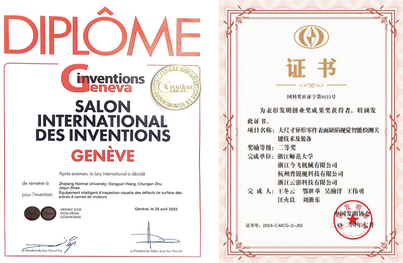 大尺寸异形零件表面缺陷视觉智能检测关键技术及装备,获2024年中国发明协会二等奖。
