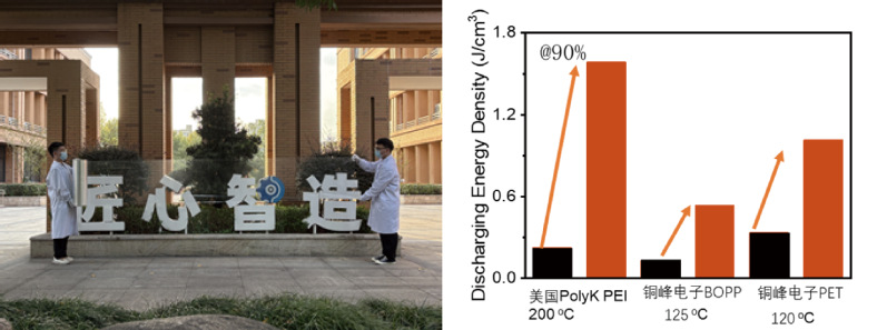 本团队开发了内部离子化工艺,实现商用薄膜在高温条件下储能效率在90%以上的工况下,储能性相提升3倍以上。其具有工艺简单,与现有产线兼客容性好的特点。